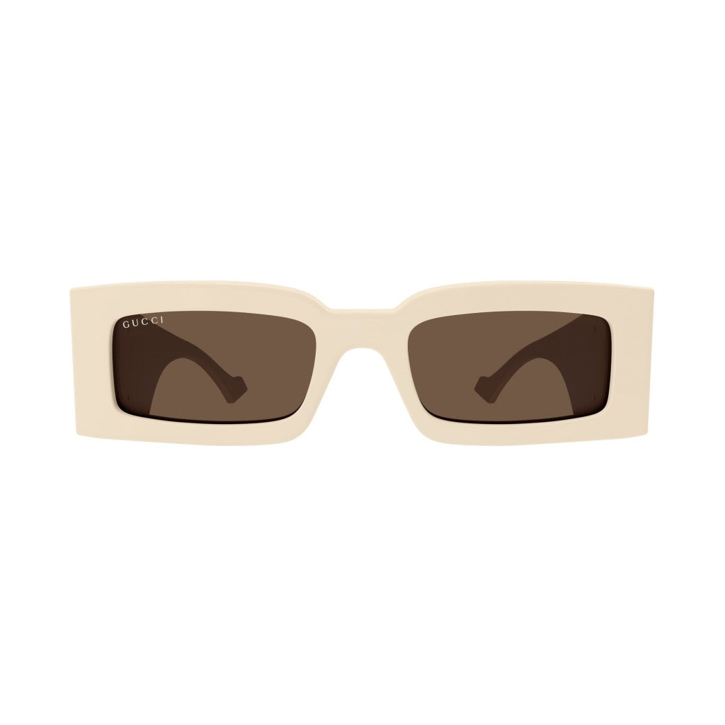 Ivory acetate frame with brown lenses.Big gold GG logos on the sides