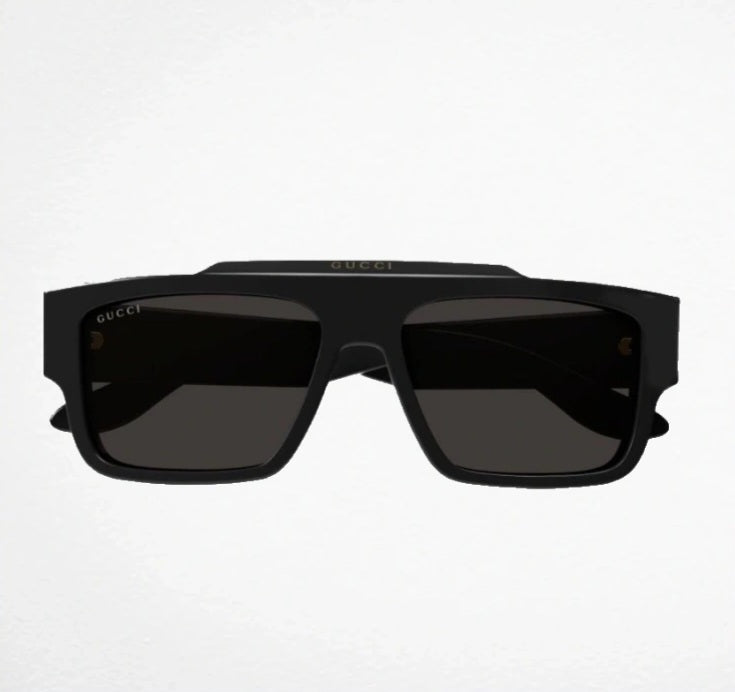 Gucci black rectangular acetate frame with dark grey lenses. Minimal Gucci logo on front